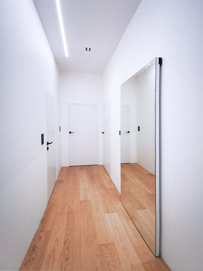 The Green Door 40 cassette is a complete set (including handrail and thimble) of standard dimensions. It consists of an aluminum cassette and a 40 mm thick sash. The system is equipped with silent carts with bearings, withstanding a load of up to 110 kg. The cassette is designed for installation in plasterboard walls with a thickness of 100 mm or 125 mm. The sash is prepared for painting with wall paints.