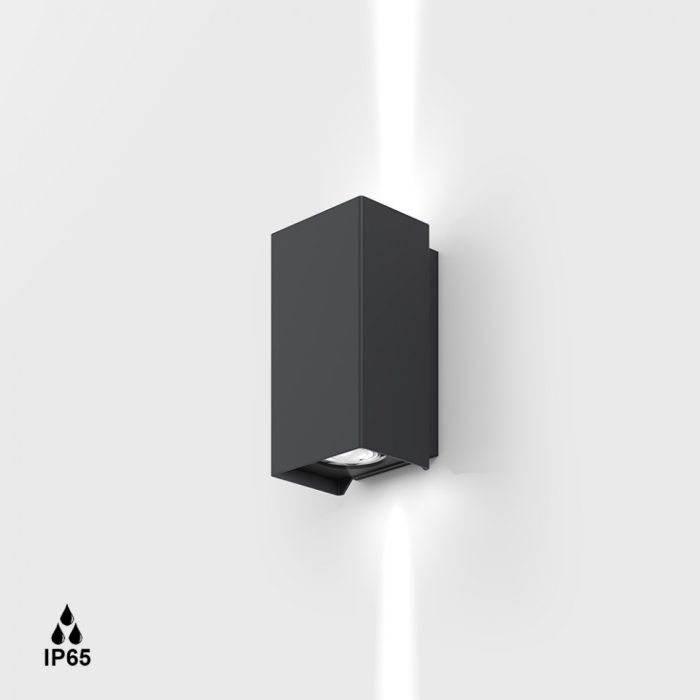 BRICK 2 luminaria mural de superficie. L70mm, sp63mm, H130mm, 2x4W LED, 3000K, 2x314Lm, 2×7, IP65, grafito