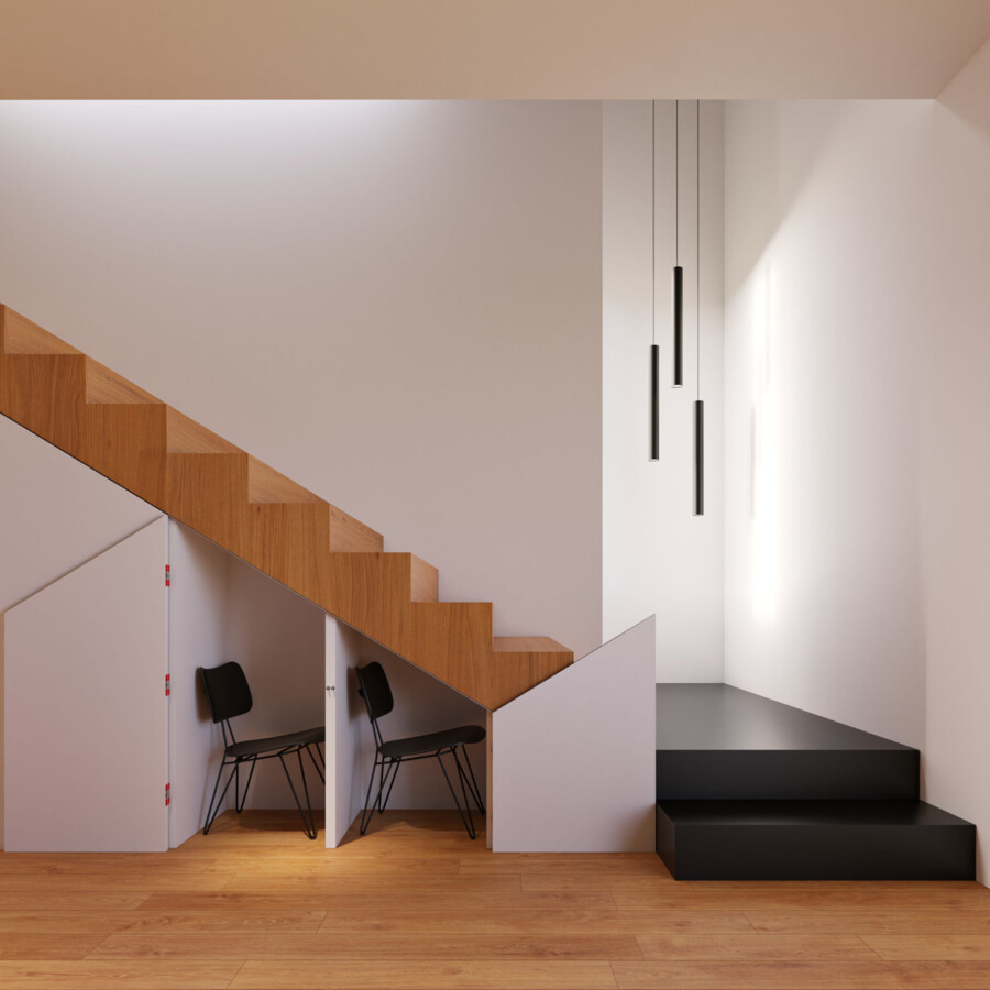 Puerta oculta pendular Sara. Marco de aluminio oculto sobre bisagras abatibles. Hoja sin galce, apertura a ambos lados, posibilidad de cambiar el sentido de apertura en la fase de instalación.